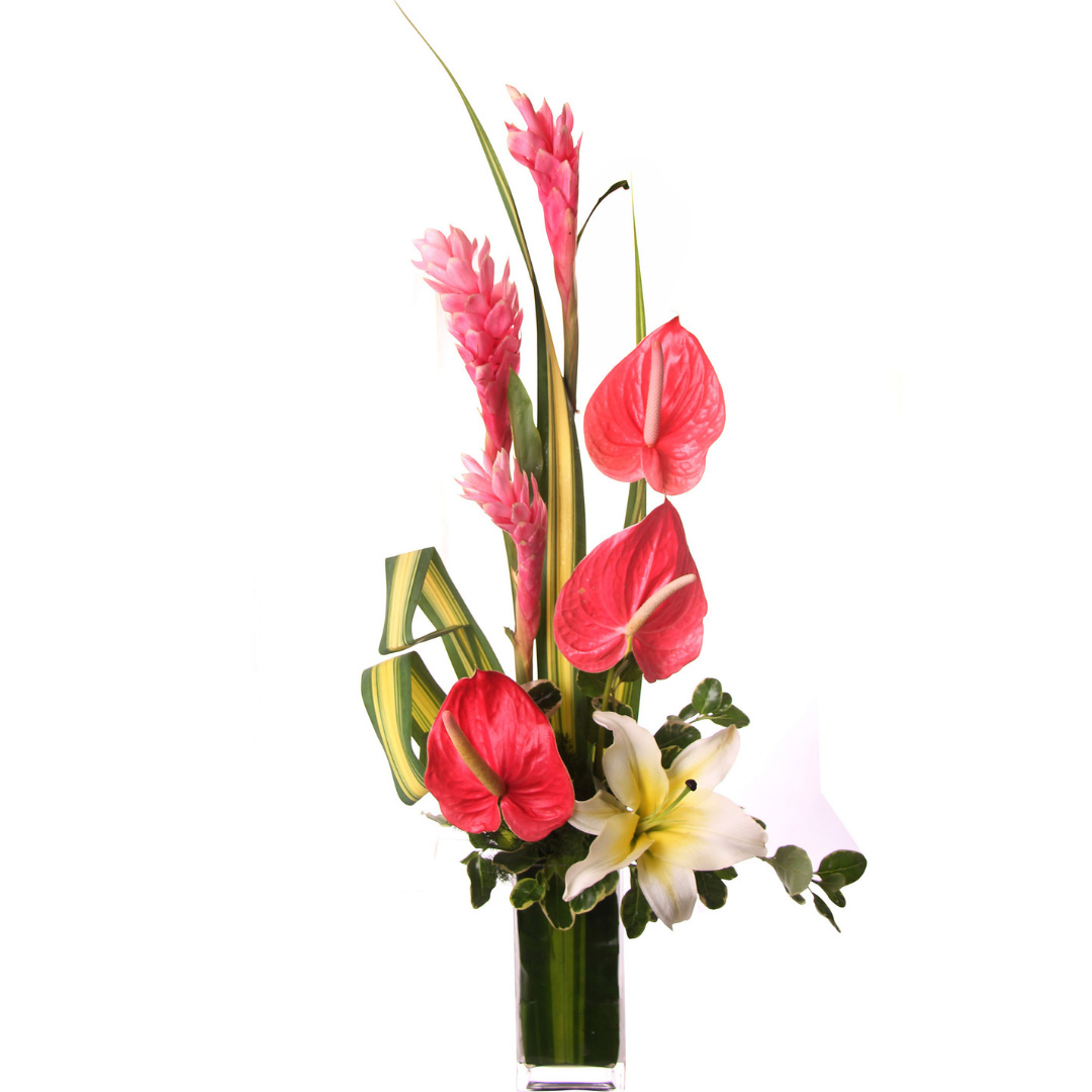 Elegante arreglo exótico con anturios, gingers y liliums base de vidrio.