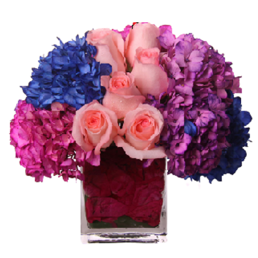 6 rosas y hortensias de colores en fina base de vidrio. Alt. aprox del arreglo 30 cm.