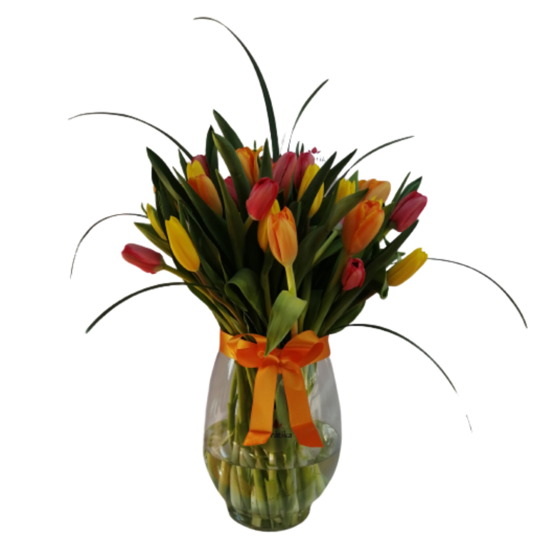 30 tulipanes en fino jarrón de vidrion. Alto aprox del arreglo 50 cm.