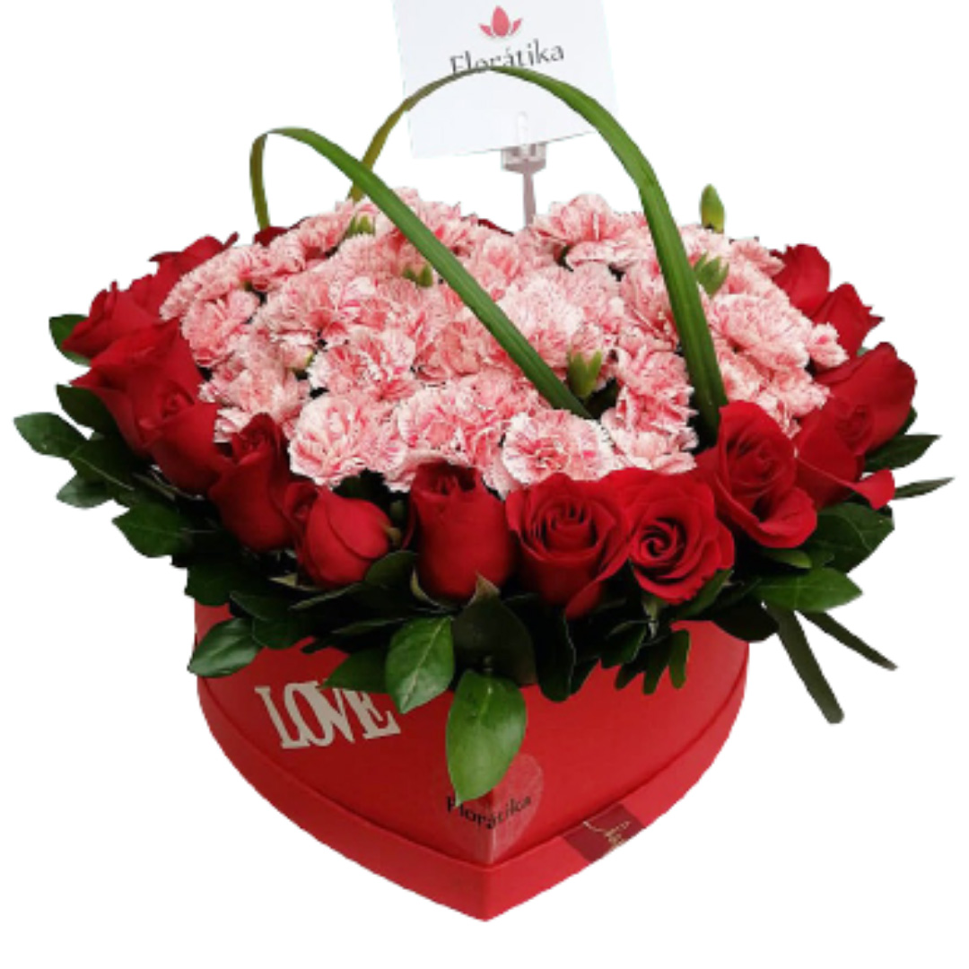 Minirosas y claveles en box corazón. Diámetro aprox. del arreglo 25 cm.