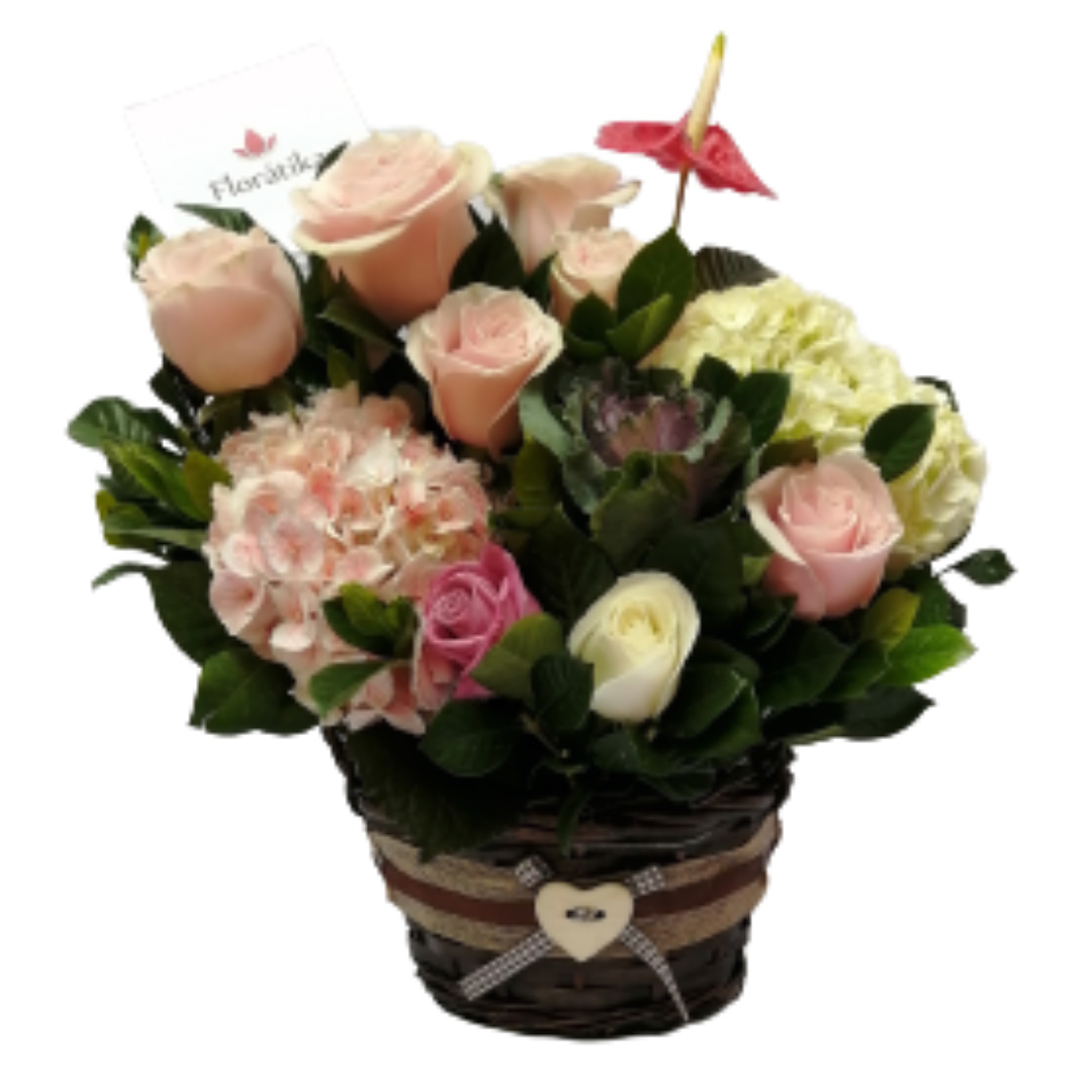 Rosas selectas, hortensias y anturio en exclusivo cesto estilo rústico. Alto del arreglo 30 cm. aprox.