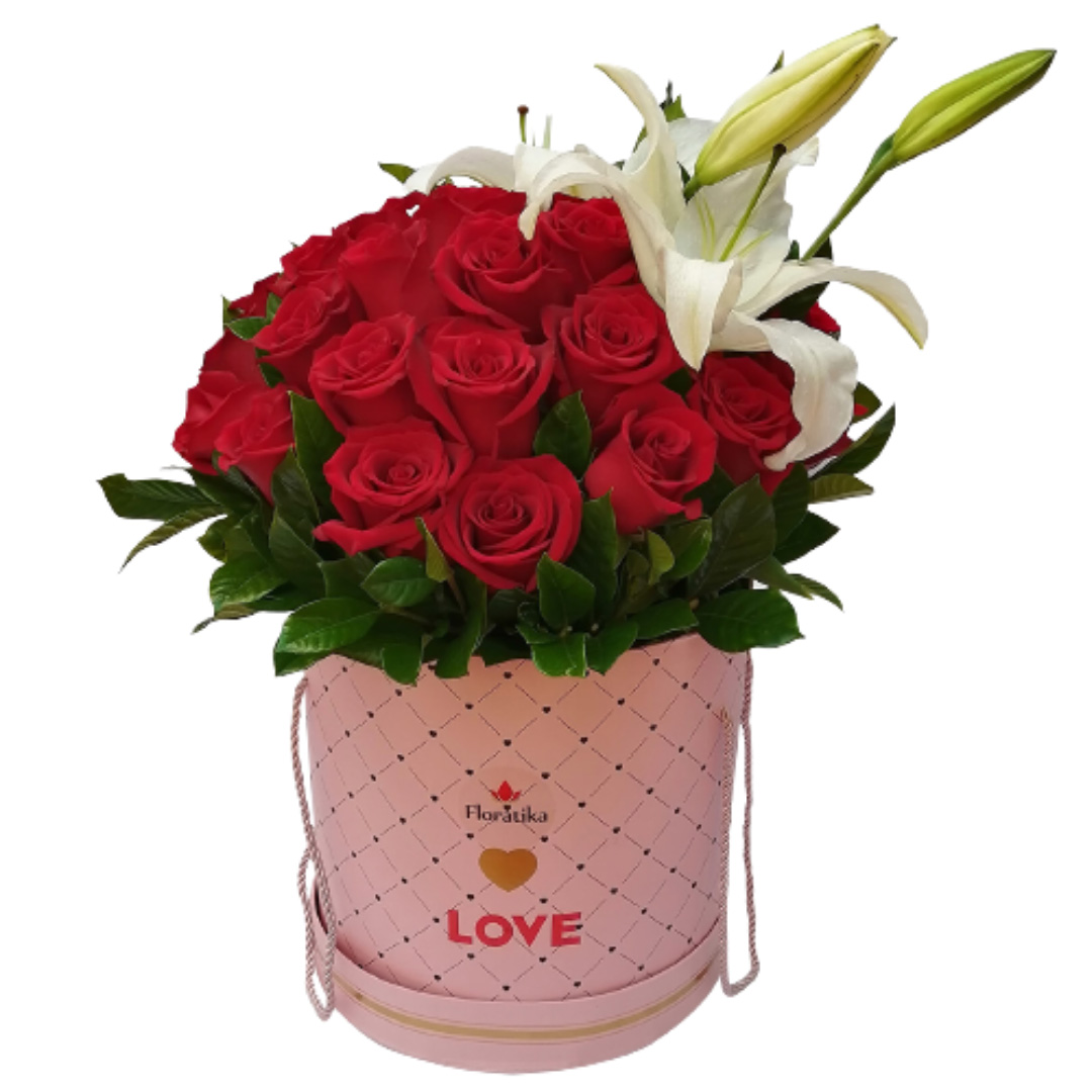 Hat box premium con 24 rosas y liliums. Alt. aprox del arreglo 45 cm.