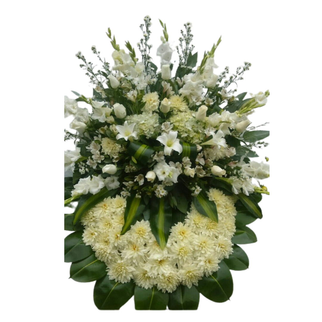 Corona con rosas, azucenas, claveles , hortensias, pompos y gladiolos. Alt. 2.20 mt. El color de las flores puede variar a solicitud del cliente.