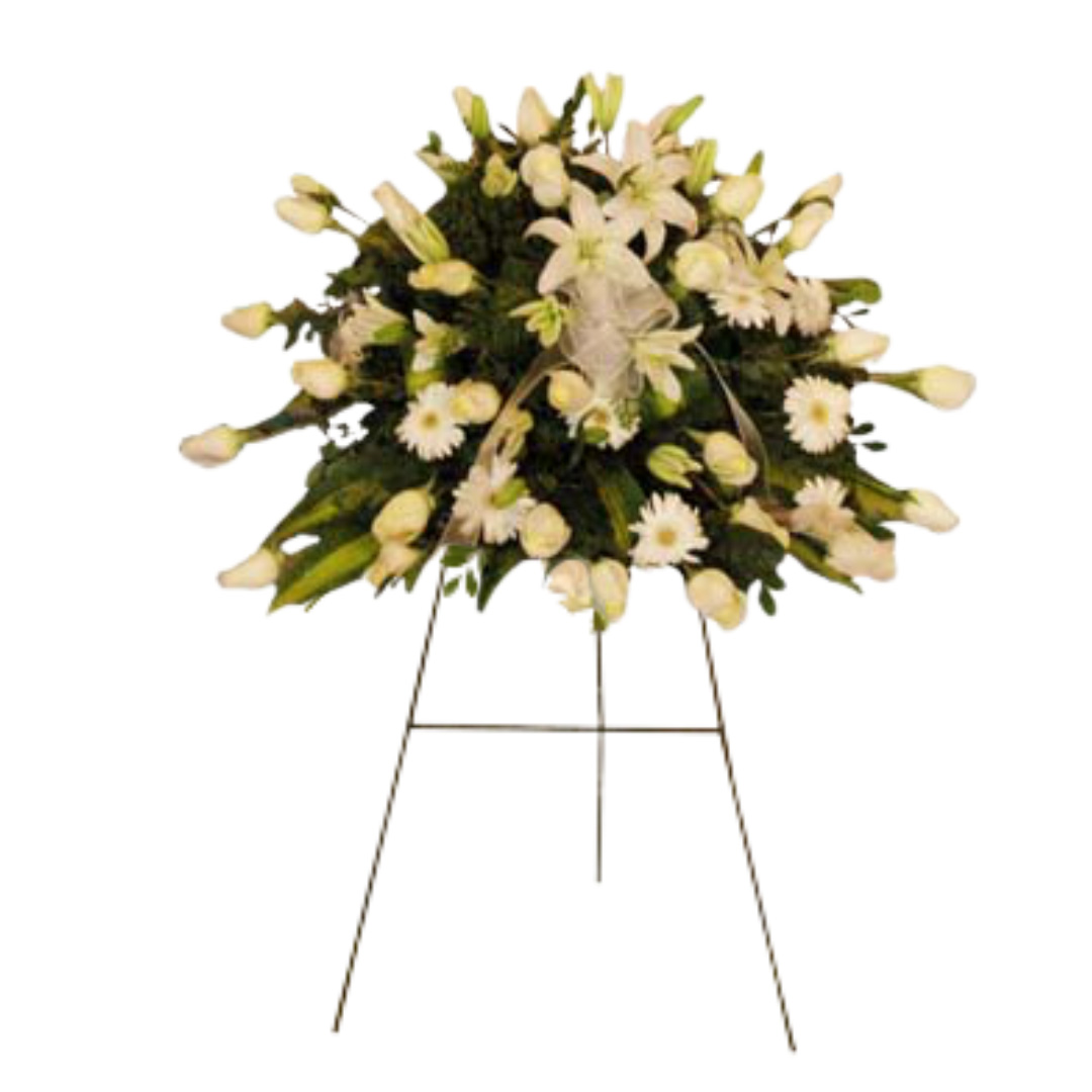 Lágrima fina con rosas, gerberas y liliums en pedestal de metal. Alt. 1.50 mt. El color de las flores puede variar a solicitud del cliente.
