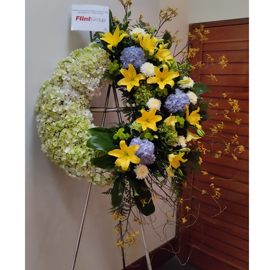 Corona fina con liliums importados, hortensias de vivero en colores y hortensias blancas, Alt. 2.30 mt. aprox.El color de las flores puede variar a solicitud.
