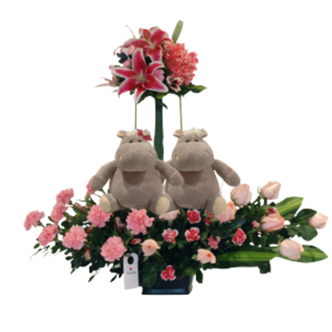 2 hipos medianos con rosas, claveles, liliiumss y hortensias. Para bebito hombrecito los colores de las flores cambian a melones, cremas y toques azules.