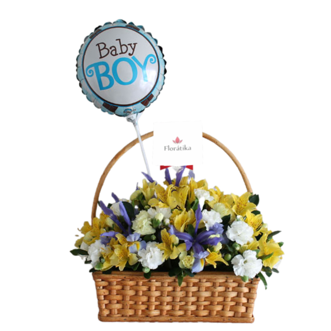 Claveles, astromelias y flores de estación en canasta de mimbre y globo. Para bebita el color de las flores son en tonos rosas así como el globo.
